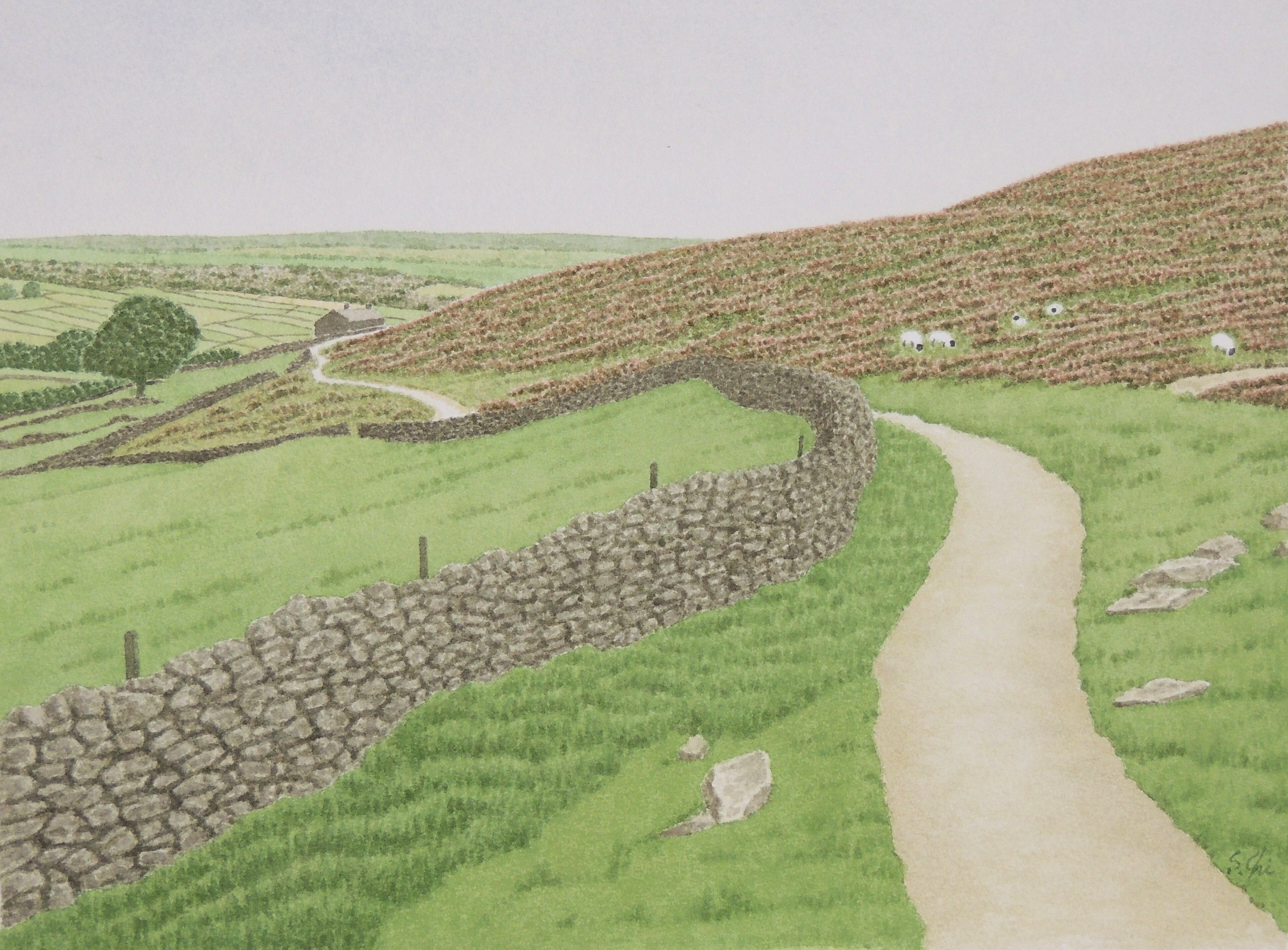 トップ・ウィゼンズへとつづく道は、ホワース・ムーアのなだらかな北斜面につづいている。道の左手には、一面がヒースでおおわれた荒野が広がっている。右側の下のほうには、ワ―ス川が西から東へと流れている。