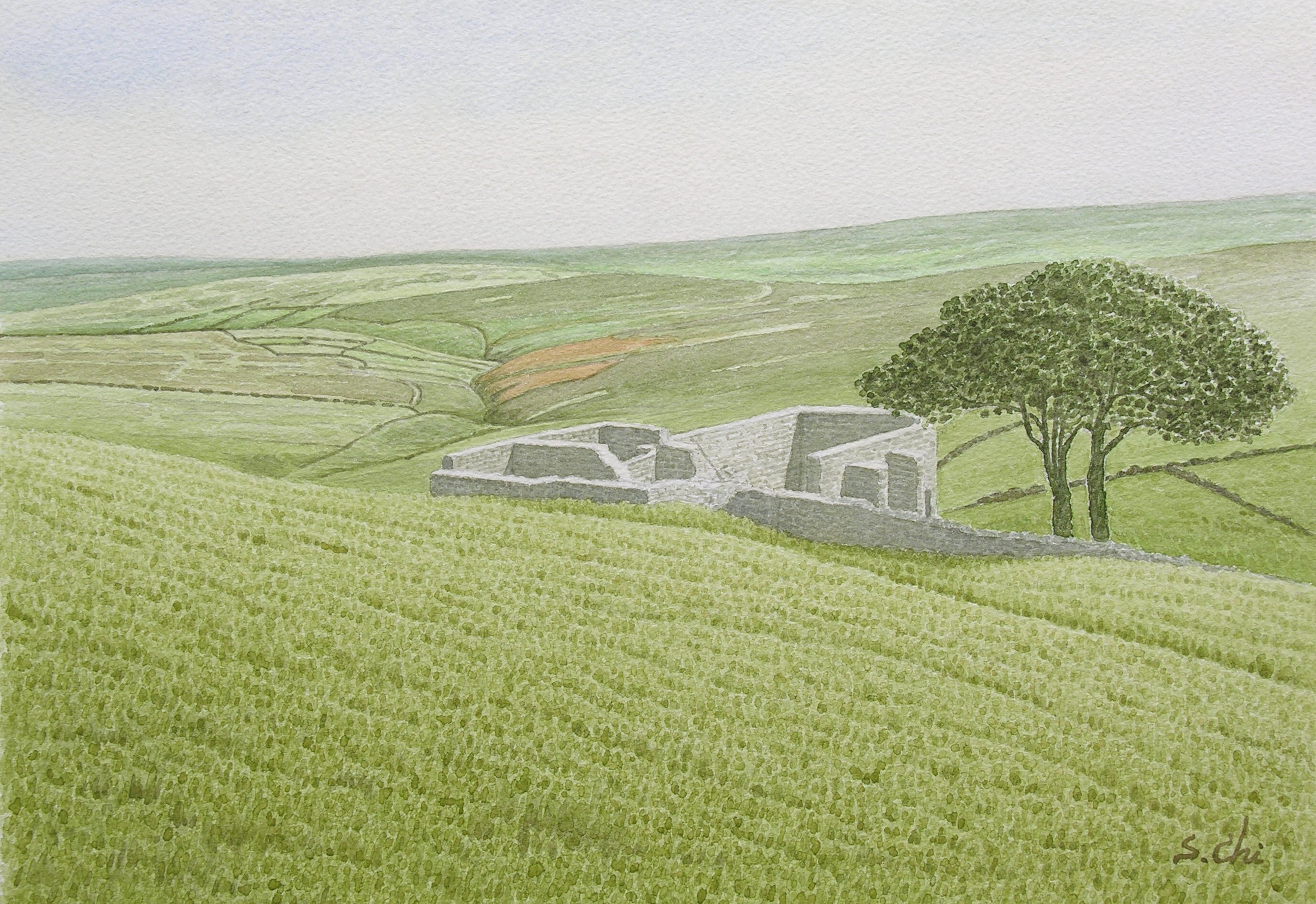 ところでトップ・ウィゼンズにある廃屋を描くには、おおいに苦労することになった。ただ廃屋を描いたのでは、この有名な廃屋なのか、それともほかのどこかにある廃屋なのか、分からないからである。じっさい丘陵地帯を歩いていると、似たような廃屋を結構、見かける。