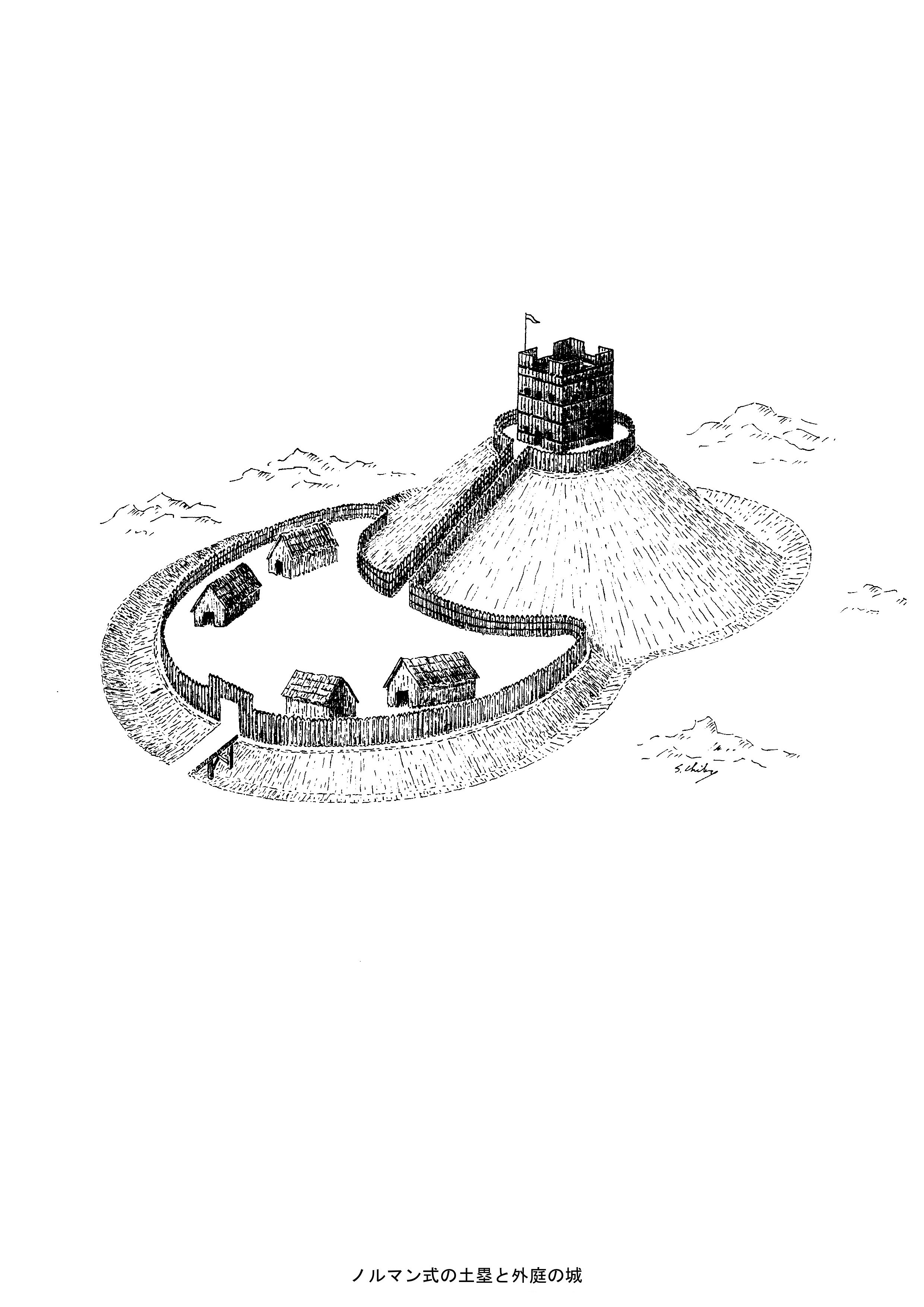 *土塁と外庭の城 (motte-and-bailey castle) 土を盛った土塁(motte)と、その下の外庭(bailey)からなるノルマン式の城。土塁の上には、2層から3層構造の木造の四角い塔キープ(keep)が建てられた。キープと外庭、それらをつなぐ階段のまわりには、先端を尖らせた丸太を連ねた防御柵(palisade)がめぐらされ、さらにその外側には壕(ditch)が掘られていた。短期間で築城できたのが特徴。ウィリアム1世は、征服と同時にサクソン人を使役して城を築き、支配地を広げていった。