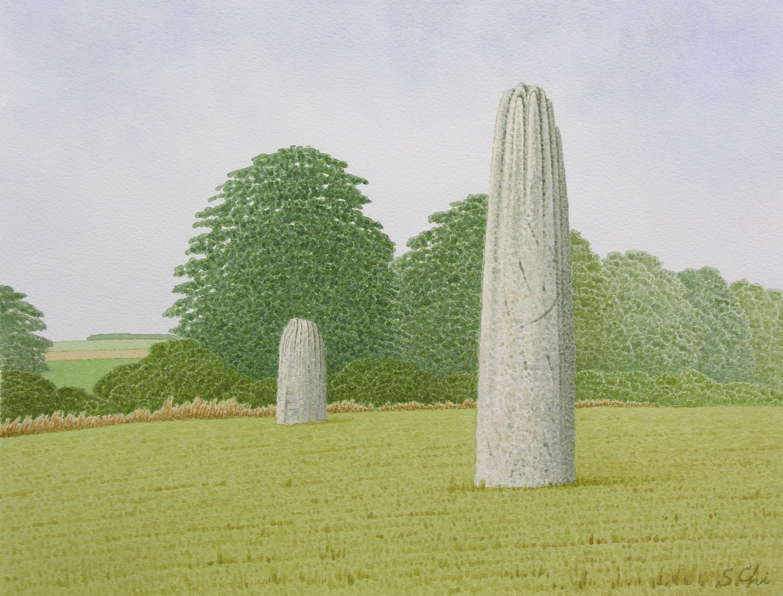 この水彩画は、中央にある石と、それから北に60mほど離れたところにある石を描いたものである。もっとも背の高い石は、画面の反対側に110mほど離れて、道路をへだてた林のなかにある。