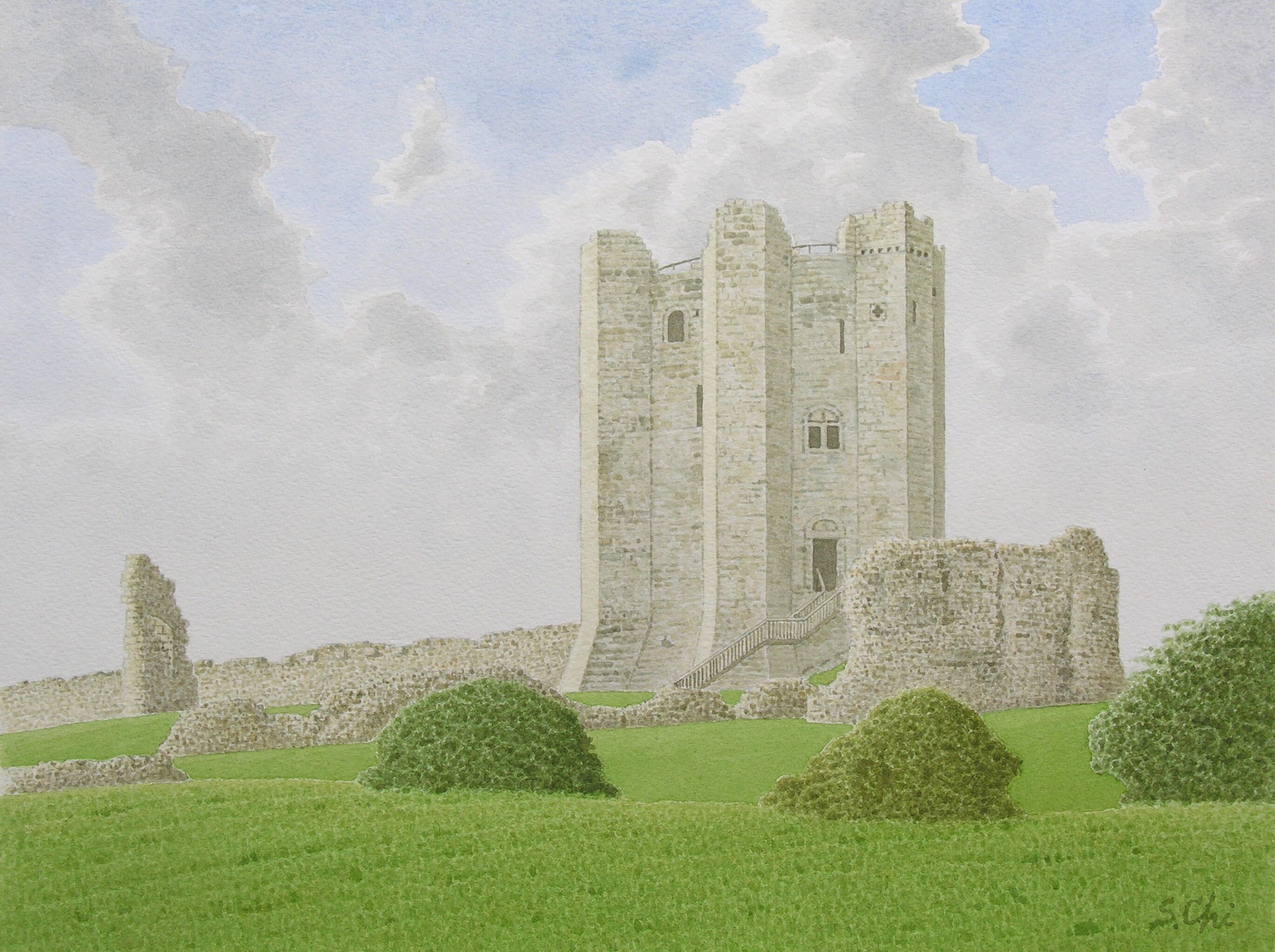 城には白い石が使われているので、日の光をうけると、白くかがやいて見える。このキープは構造物としての形の美しさがあり、まわりの崩れた城壁やゲイトハウス(門楼)などが目に入らなければ、城というよりも、なにかのモニュメントのようにも見える。