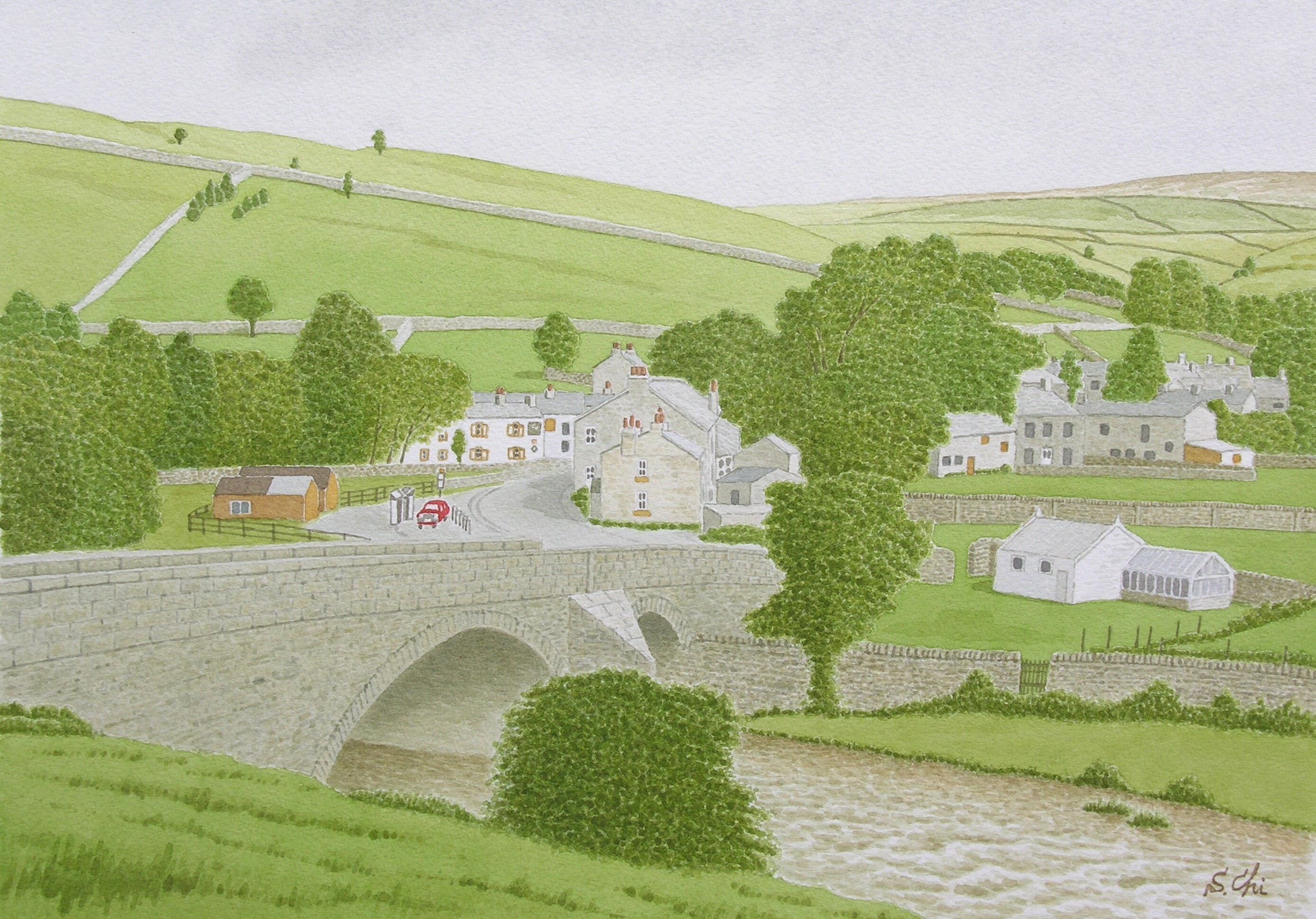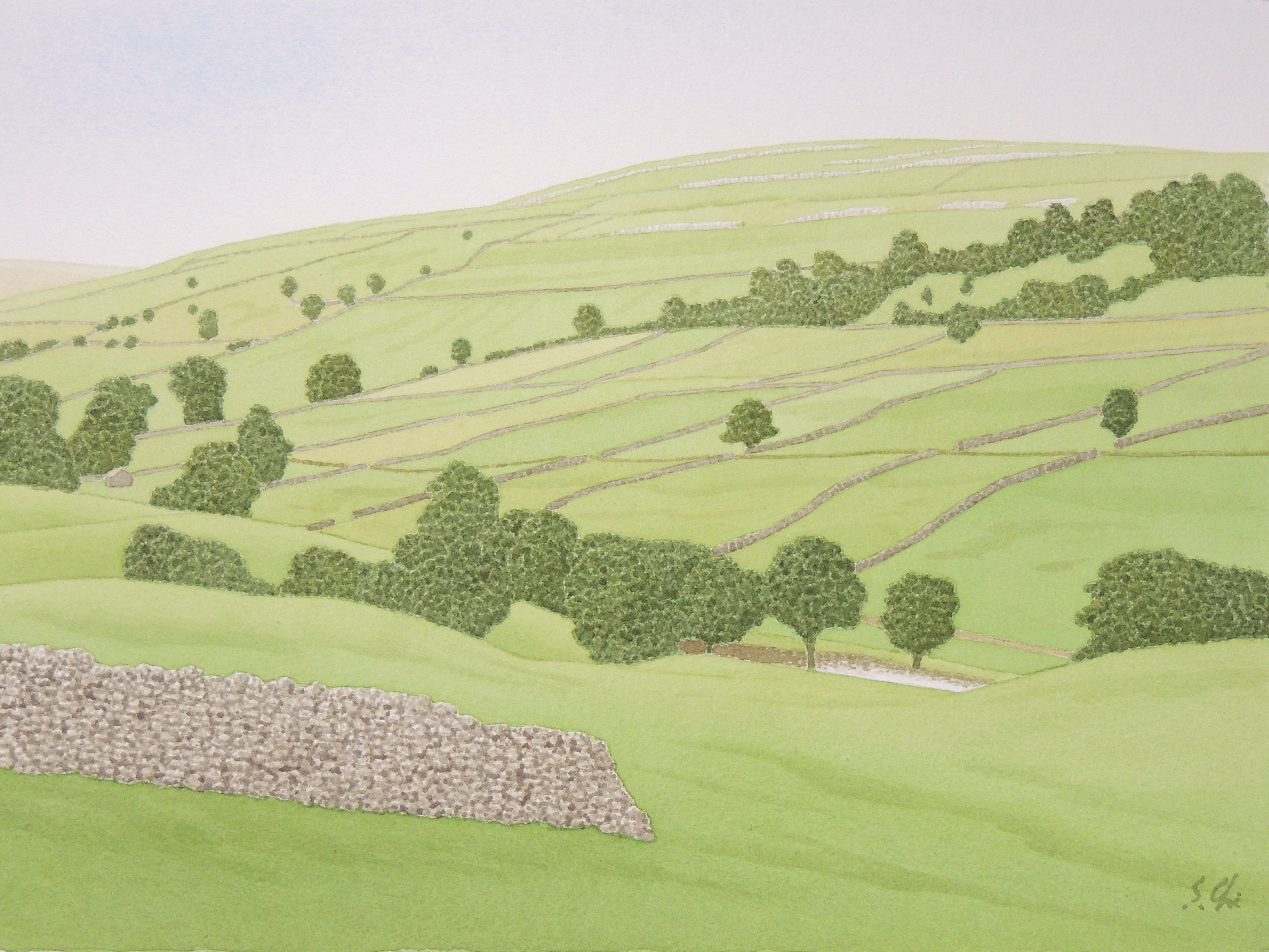 村の東側――この水彩画の右奥のほう――には、ヨークシャーで第4位の標高(約703m)を誇るグレート・ウェアンサイドの丘が重々しく横たわっている。おもしろいことに、ヨークシャーで標高が約736mで第1位の山は、ただの「ウェアンサイド」と呼ばれている。