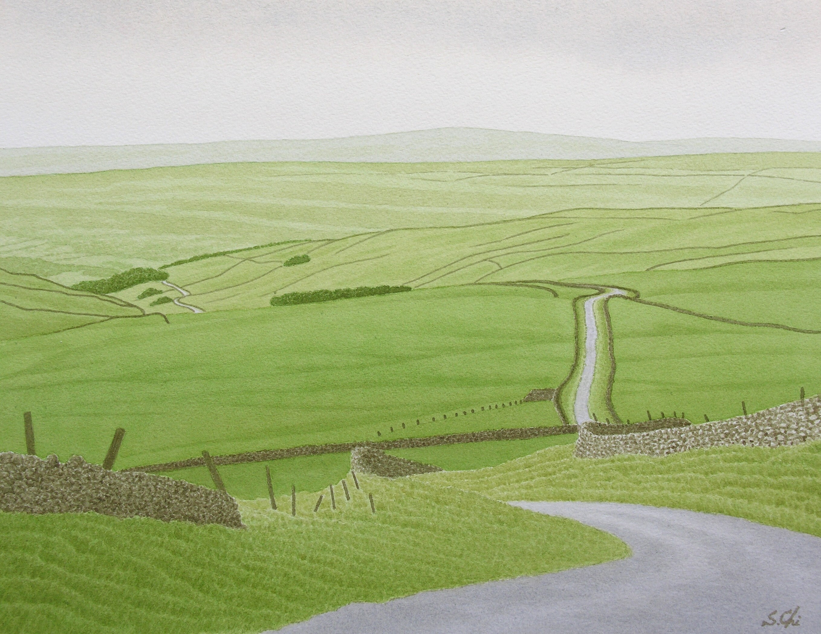 この水彩画は、クレイ付近から、南のウォーフデイルの下流のほうを望んだ眺めである。ペニゲントは、画面の外、右のほうにある。