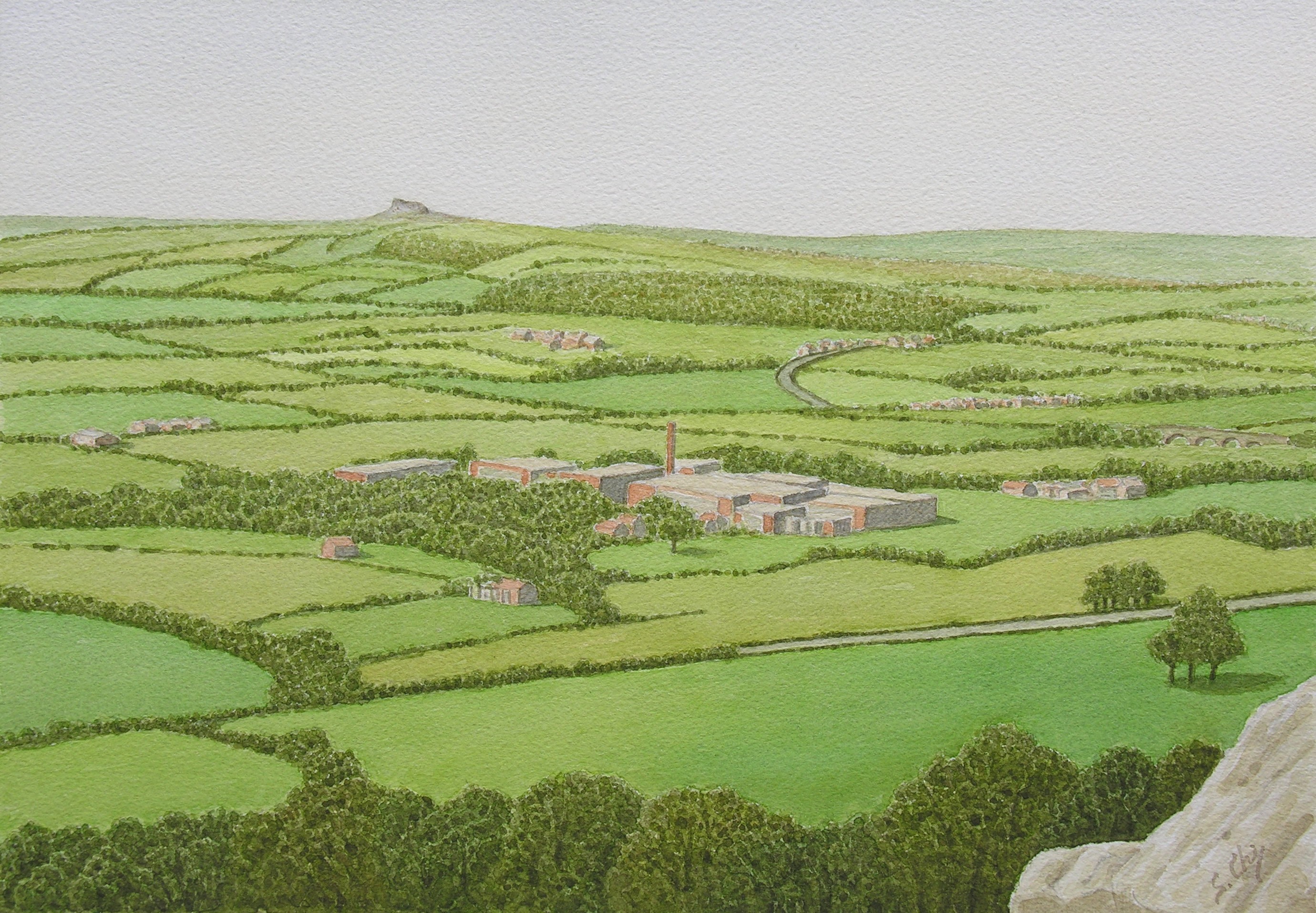 そこに登ると、北側に広がる田園の風景を、一望のもとに見渡すことができる。眼下の緑の草地のなかをウォーフ川が流れ、そのそばに、高い煙突をもったレンガ造りの工場があった。ヨークシャーは羊毛工業がさかんな地域なので、紡績工場だったかもしれない。