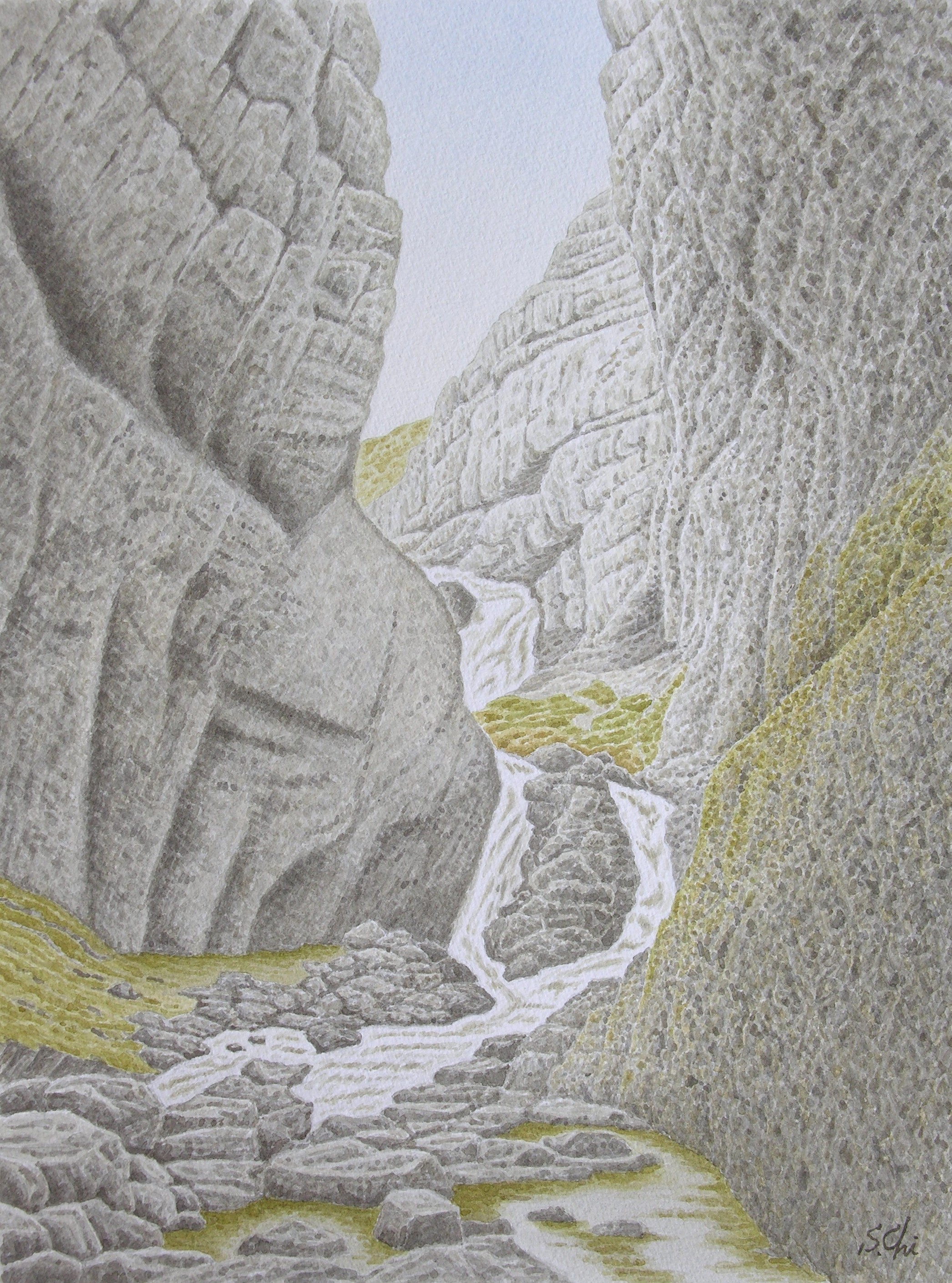 峡谷の両側の断崖の高さは、70mほどある。峡谷の幅は、入口では100mかそれ以上あるが、奥へゆくにつれてしだいに狭まってくる。そして両側の断崖は、おおいかぶさるようになってくる。