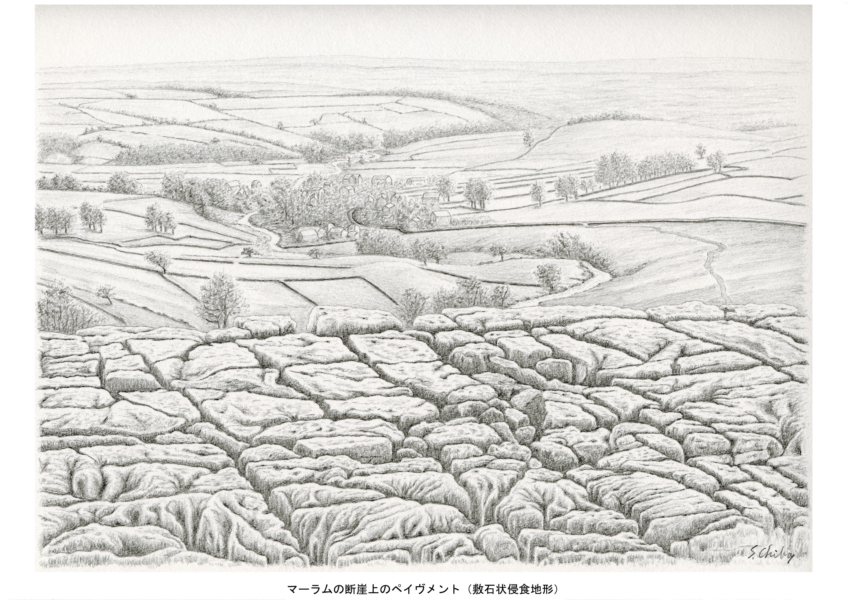 かつて川底だったところは、石灰岩が浸食されて、大きな裂け目がモザイクの目のように走っている。このような浸食地形は、石畳のように見えることから、「ペイヴメント」と呼ばれている。